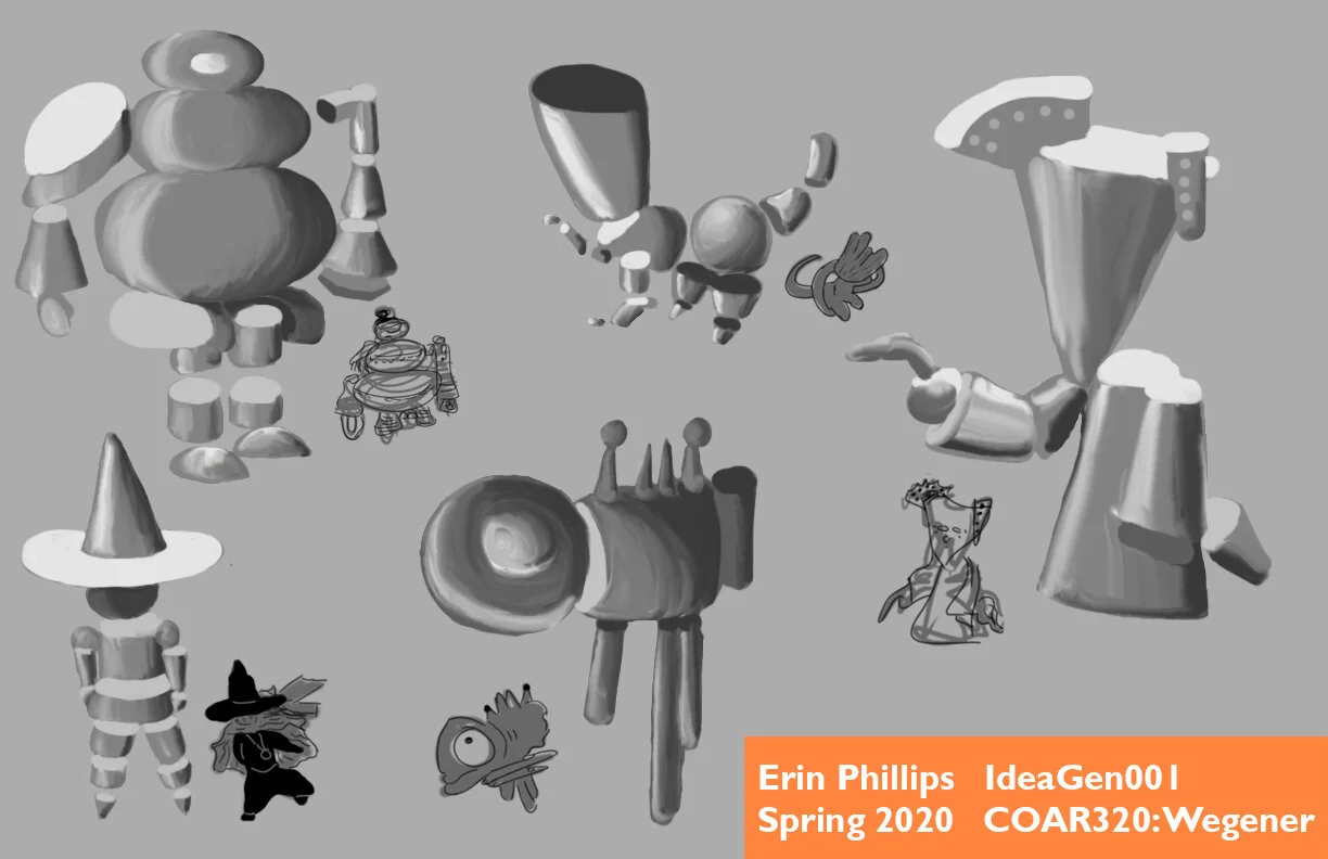 The first character I created in my concept art class. The process involved making dozens of random ink blots, scribbled, and textures; selecting fifteen to make into line art; narrowing further to five forms; then exploring two of those characters until a favorite was chosen. I also in a subsequent project created an isometric environment for Maggie. The cottage I designed is only the second environment I have ever produced.